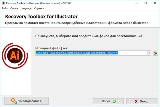 Recovery Toolbox for Illustrator (Windows). Для пользователей Windows оптимальным решением признана специальная утилита Recovery Toolbox for Illustrator. Эта программа специально разработана для восстановления данных из поврежденных .AI-файлов любых версий Illustrator. Она анализирует внутреннюю структуру файла, пытаясь прочитать исправные данные и пересобрать документ заново. Преимущество этого инструмента – узкая специализация: алгоритмы поиска и восстановления данных настроены под работу с форматом файлов Adobe Illustrator, за счет чего вероятность восстановления выше, чем при использовании универсальных файловых реаниматоров.