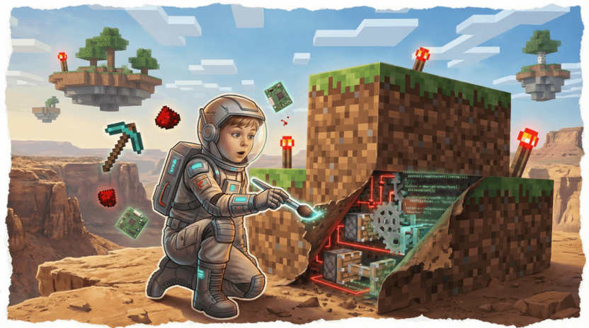 Знакомая вселенная. Не нужно объяснять, что такое блоки, крипер или редстоун. Ребёнок уже знает мир – осталось научиться им управлять.