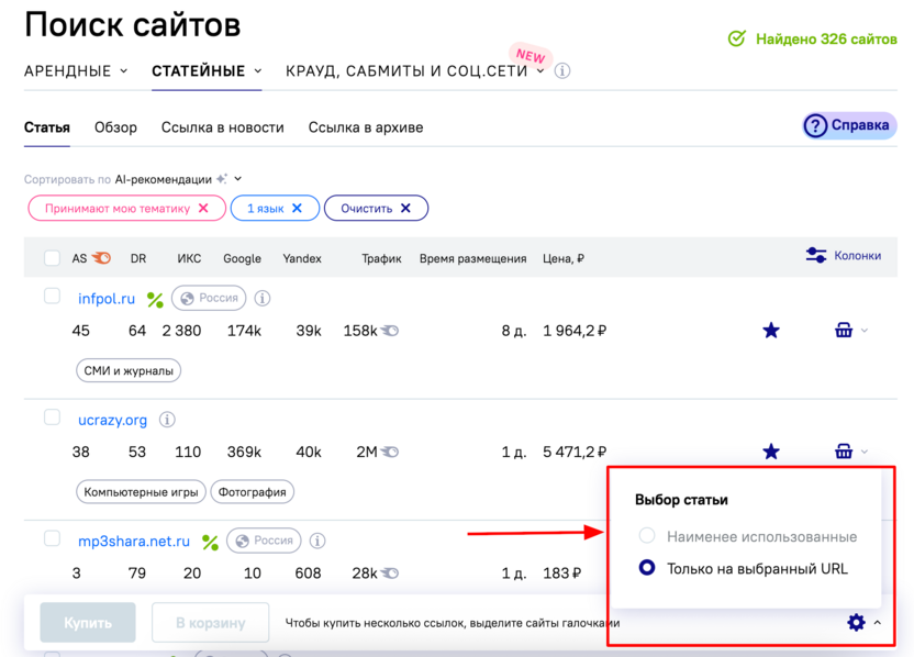 - «Только на выбранный URL» — дает полный контроль над размещением. Пользователь самостоятельно указывает, на каком именно ресурсе должна появиться статья. Это особенно полезно, когда необходимо закрепиться на конкретных проверенных площадках или отработать точечную стратегию продвижения.