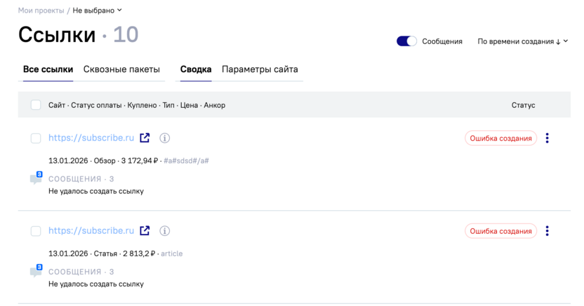 Если на каком-то этапе размещения статьи возникает проблема, ссылка больше не остается в подвешенном состоянии, как это бывало раньше. В случае сбоя она автоматически получает статус «Ошибка создания». Пользователь сразу видит, что с размещением возникли сложности, и может оперативно отреагировать. Достаточно нескольких кликов, чтобы пересоздать ссылку или удалить ее.
