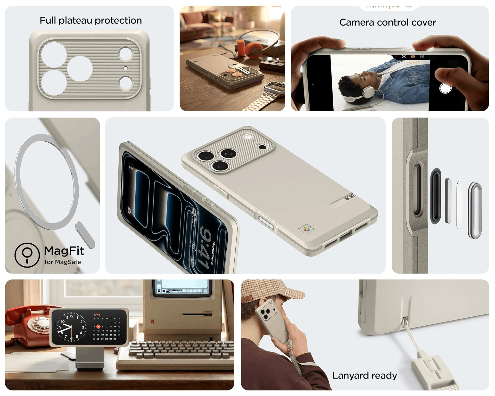 Чехол оснащен магнитным кольцом, поддерживает MagSafe, совместим с сенсорной кнопкой Camera Control для управления съемкой и имеет отверстие для крепления ремешка. Аксессуар изготовлен из комбинации термопластичного полиуретана и поликарбоната.