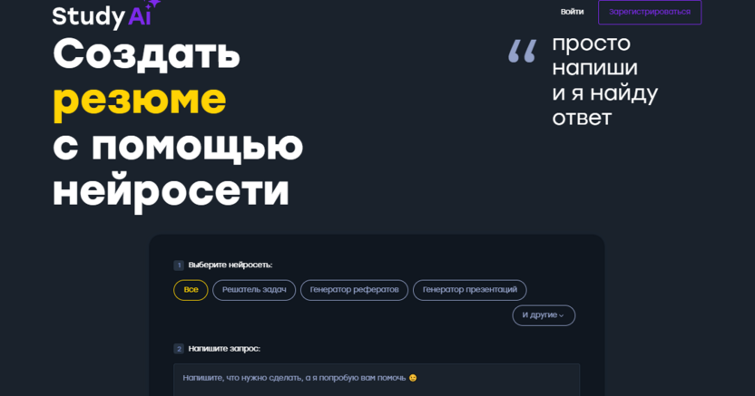 - StudyAI – русскоязычная платформа-агрегатор нейросетей, где специальный раздел позволяет быстро генерировать резюме с помощью ИИ. Сервис удобен для студентов и специалистов, предлагает шаблоны и рекомендации по формулировкам.