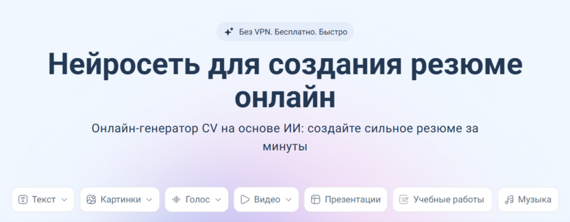 GPTunnel – это нейро-офис и агрегатор популярных ИИ-моделей (ChatGPT, Claude, Gemini и другие), предоставляющий стабильный доступ через защищенные туннели. Специализированный ассистент для резюме позволяет настраивать бота под личные нужды, генерировать текст документа и дополнять его визуалами. Сервис подходит для комплексной подготовки: от текста до видео-презентаций. Он обеспечивает высокую скорость и отсутствие региональных блокировок.
