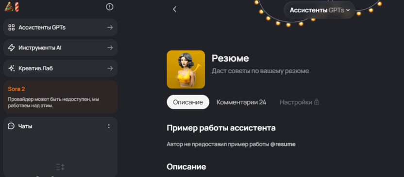 - GPTunnel – нейро-офис с ассистентами на базе ИИ, где есть специализированный помощник для создания резюме. Вы можете настроить бота под свои нужды, генерировать текст, изображения и даже видео для портфолио.