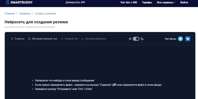 SmartBuddy – это специализированный ИИ-инструмент на базе топовых нейросетей, ориентированный на анализ рынка труда и тенденций. Он изучает успешные резюме и требования работодателей, предлагая релевантную структуру, избежание ошибок и представление опыта в выгодном свете. Сервис поддерживает работу с файлами разных форматов и интеграцию с Telegram/VK-ботами.
