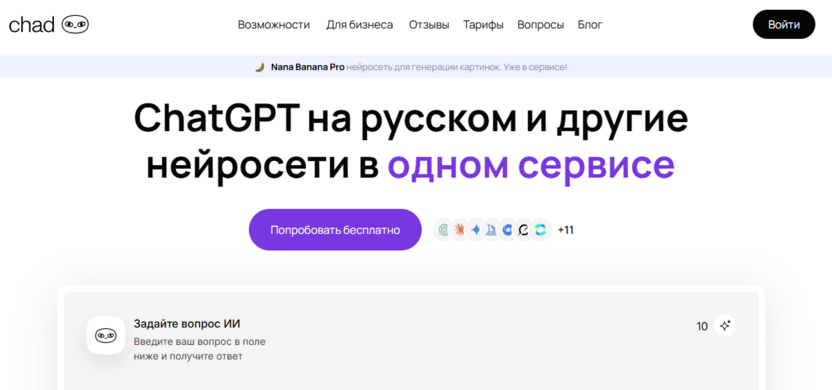 Chad AI – российская платформа с доступом к продвинутым моделям, ориентированная на бизнес-задачи. Генерирует резюме с профессиональными формулировками, оптимизацией под вакансию и добавлением ключевых слов. Поддерживает интеграцию в мессенджеры, память сессий и генерацию изображений/видео. Хорош для автоматизации деловых текстов.