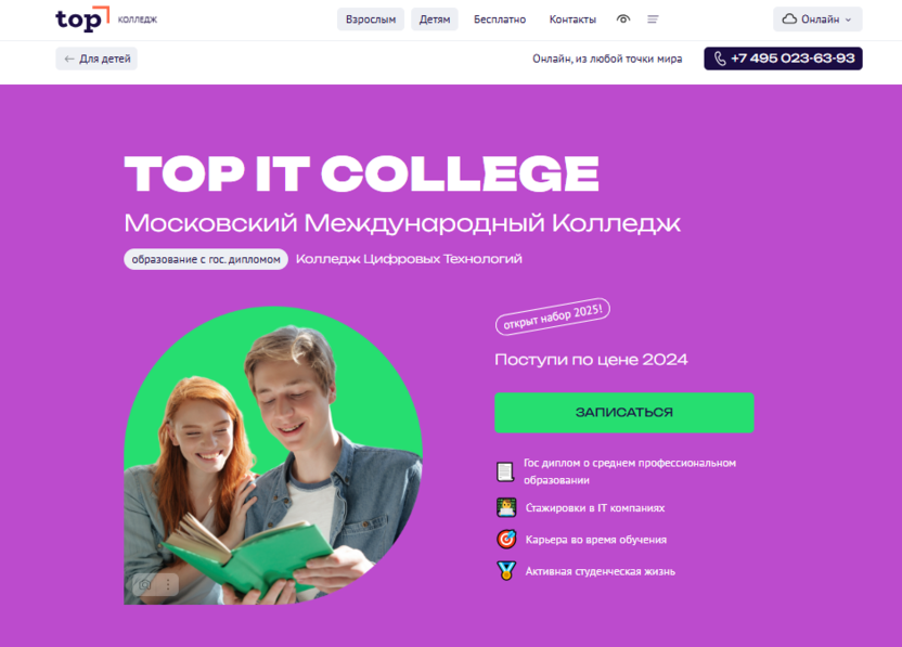 TOP IT COLLEGE является одним из ведущих образовательных учреждений в области IT, предлагающим студентам возможность получить образование с государственным дипломом. Колледж предлагает актуальную программу, сфокусированную на получении практических навыков и трудоустройстве выпускников. Особое внимание уделяется развитию soft skills, проведениям открытых защит проектов с участием работодателей и активно студентов. К услугам студентов предлагаются современные аудитории, гибкий график и возможность совмещать учебу с работой.