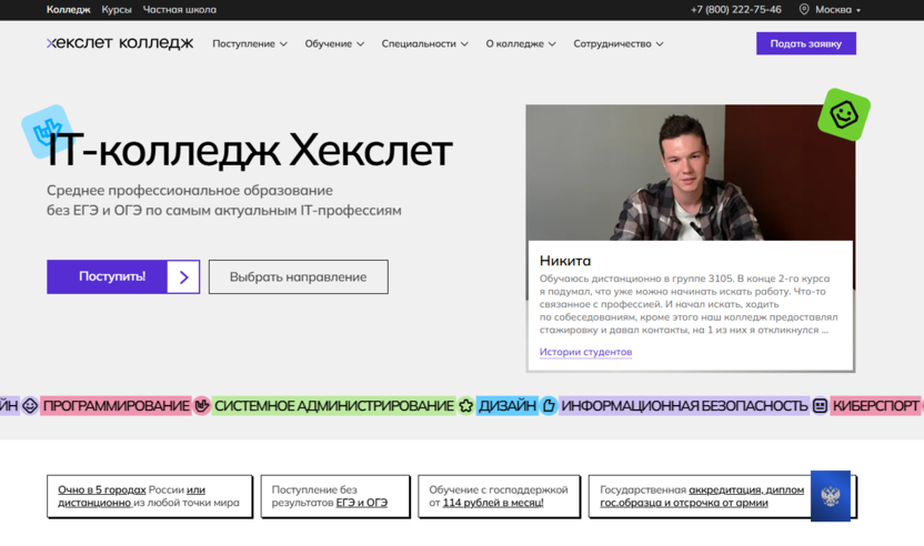 - Хекслет Колледж: поступление без ЕГЭ/ОГЭ, отсрочка от армии, акцент на IT и практику, индивидуальные треки.