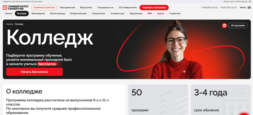 - Университет «Синергия»: обучение от 150 руб./мес, центр карьеры, очно-дистанционный формат, многоуровневая система образования.