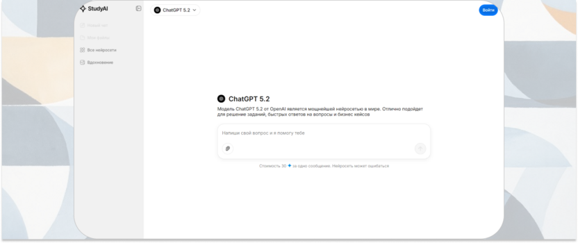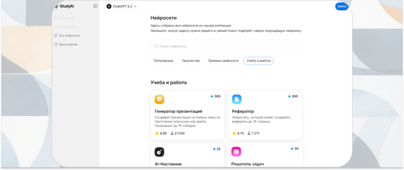 Образовательная платформа с набором нейросетевых инструментов для обучения работе с искусственным интеллектом. Сервис включает доступ к различным ИИ-ботам, которые помогают освоить генерацию изображений, текстов и других форматов контента. Study AI подходит для знакомства с возможностями современных нейросетей через практические задания.