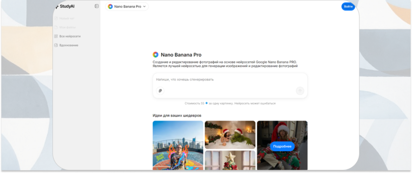 Платформа включает встроенный редактор промтов с подсказками и автодополнением. Пользователи выбирают стиль из библиотеки, настраивают параметры генерации и получают результат в высоком разрешении. Nano Banana Pro сохраняет историю созданных изображений и позволяет дорабатывать понравившиеся варианты через функцию вариаций.