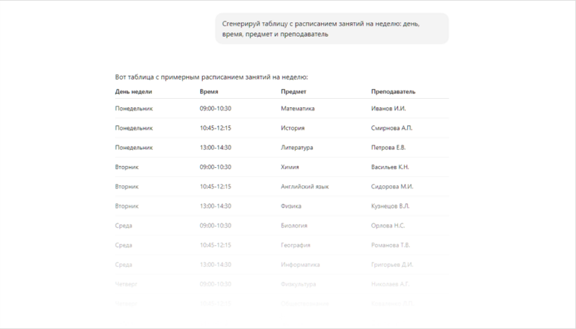 - «Сгенерируй таблицу с расписанием занятий на неделю: день, время, предмет и преподаватель».