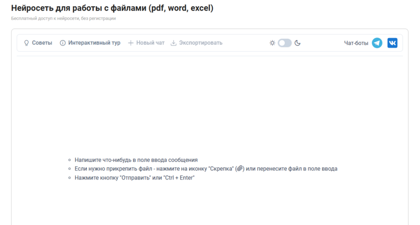 Онлайн-инструмент для работы с документами: вы загружаете PDF/Word/Excel и просите ИИ сделать анализ, пересказ, перевод или проверку на ошибки. Сервис дает базовый доступ бесплатно и без регистрации, но в гостевом режиме есть ограничения по объему и числу запросов. При регистрации открывается личный кабинет с бонусными запросами, приоритетной обработкой и расширенными лимитами.