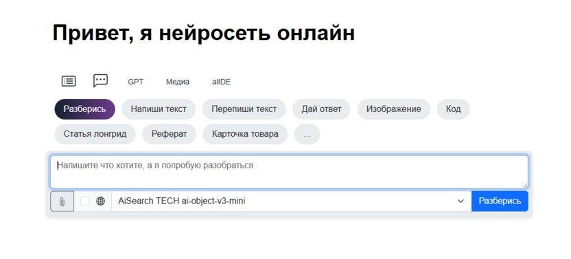 Онлайн-платформа с чат-интерфейсом и набором режимов под разные задачи, где для аналитики удобно использовать функцию «Разберись»: вы отправляете запрос (например, про метрики, тренды, причины просадки), а нейросеть формирует разбор и выводы. Сервис подходит для «быстрого ресерча» и первичной аналитики: можно получать ответы с логикой рассуждений, а также превращать текст в табличный вид через режим «Текст в таблицу».