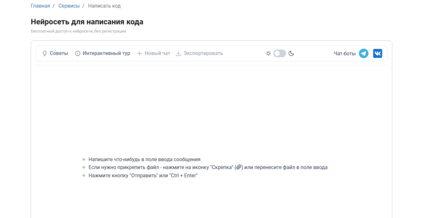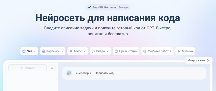 Сервис предоставляет доступ к чат-боту на базе ChatGPT-подобных моделей, который генерирует, анализирует и отлаживает код на Python, JavaScript и других языках прямо в личном кабинете. Сервис справляется с написанием функций, скриптов, API-интеграций и даже простых алгоритмов – просто опишите задачу в чате, и ИИ выдаст готовый код с комментариями и объяснениями.