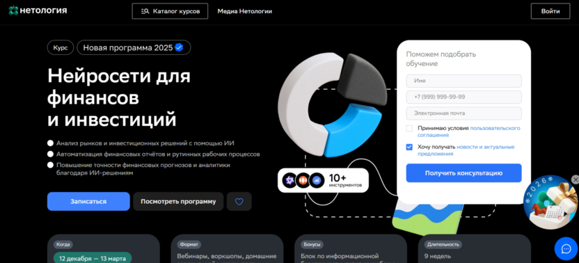 - Нетология – Нейросети для финансов и инвестиций: упор на финансовую аналитику, вечерний формат, библиотека промптов, доступ к материалам 3 года.