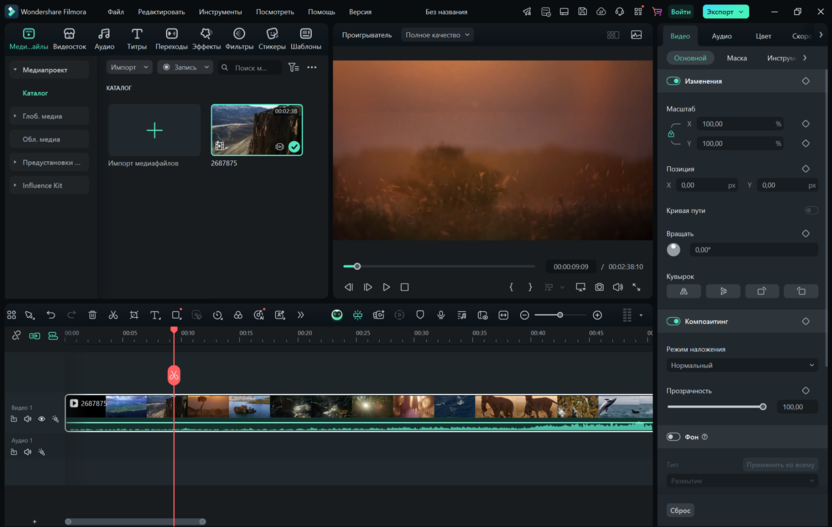 Этот редактор работает без водяных знаков и открывает проекты любой длины. Поддерживает разрешения вплоть до 8K и высокую частоту кадров. Есть маскирование объектов, трекинг движений и экспорт с кодеком H265/HEVC – то есть высокое качество при небольшом размере файла.
