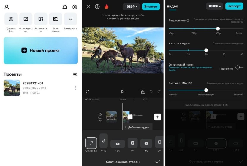 - Для TikTok или Reels скачивайте CapCut – это приложение заточено под вертикальные форматы и трендовые эффекты, поэтому видео сразу получается «как у блогеров»;