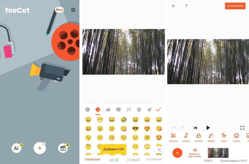 Приложение сделано для блогеров: в нем нет водяных знаков, а скорость можно регулировать с шагом до сотых долей. Поддерживаются десятки переходов и фильтров, есть встроенная библиотека музыки и возможность импортировать треки.