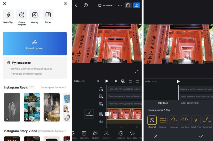 Приложение ценят за гибкость: здесь можно не просто замедлить или ускорить клип, а настроить «кривую скорости» – ускорение и торможение выглядят плавно. Есть инструмент «картинка в картинке» и поддержка зеленого экрана для креативных сцен.