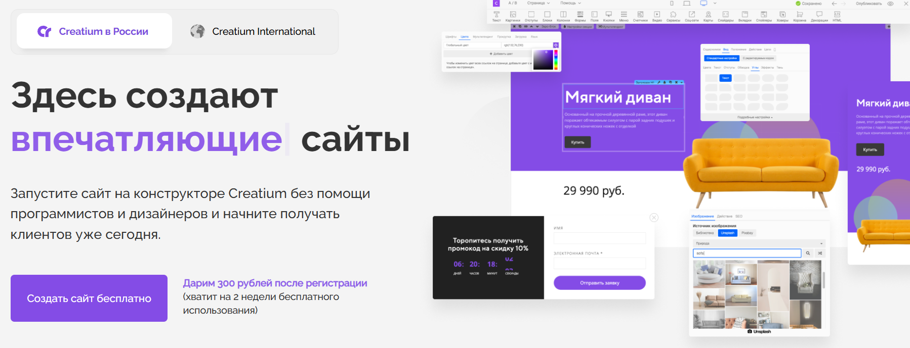- Creatium – гибкий конструктор с оплатой только за нужные функции.