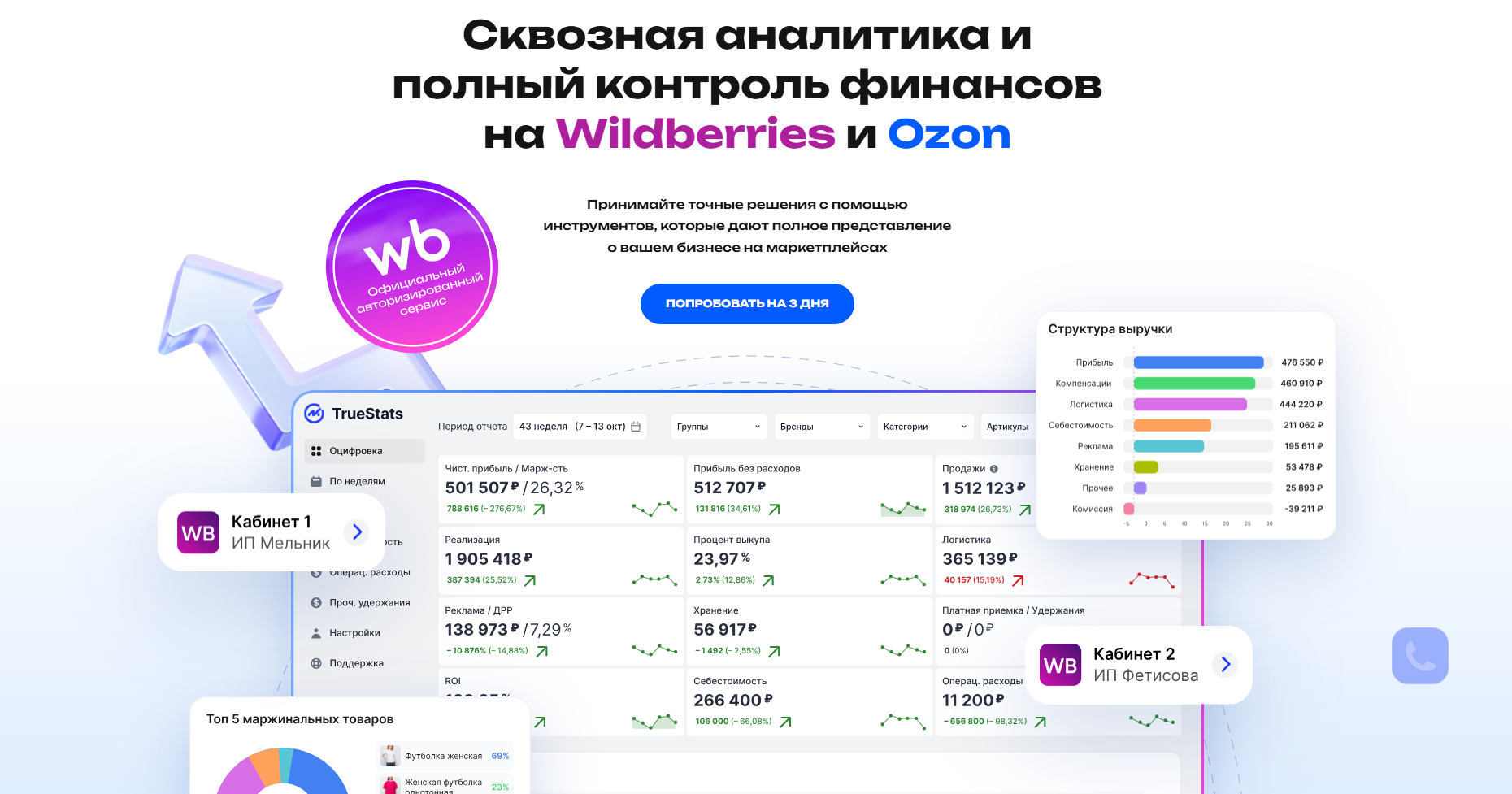 Это самый точный сервис финансовой аналитики для платформ Wildberries и Ozon, который позволяет получить четкое понимание состояния вашего бизнеса и выявить причины, препятствующие росту прибыли. TrueStats предлагает не просто отчеты, а комплексную оцифровку данных и глубокую внутреннюю аналитику, что способствует увеличению эффективности продаж.