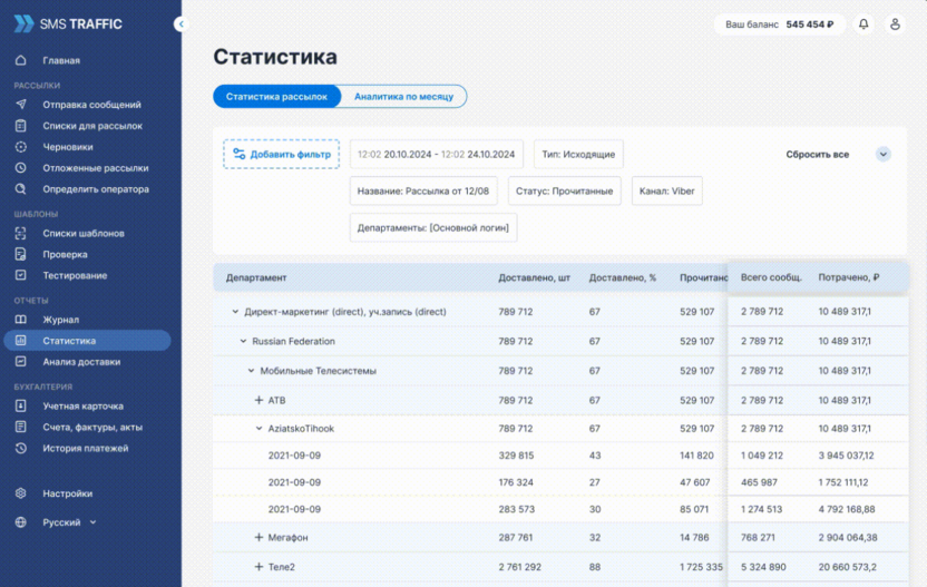 Цена: от 5,4 руб. за SMS при объёме 50 000 сообщений по России.