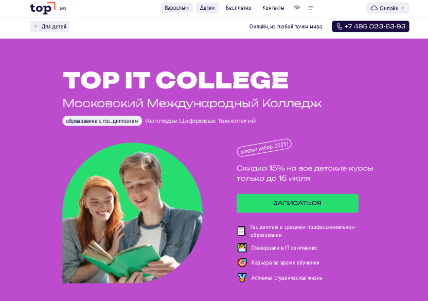 - TOP IT College: акцент на 3D- и веб-дизайн, стажировки с первого курса, участие работодателей в защите проектов.