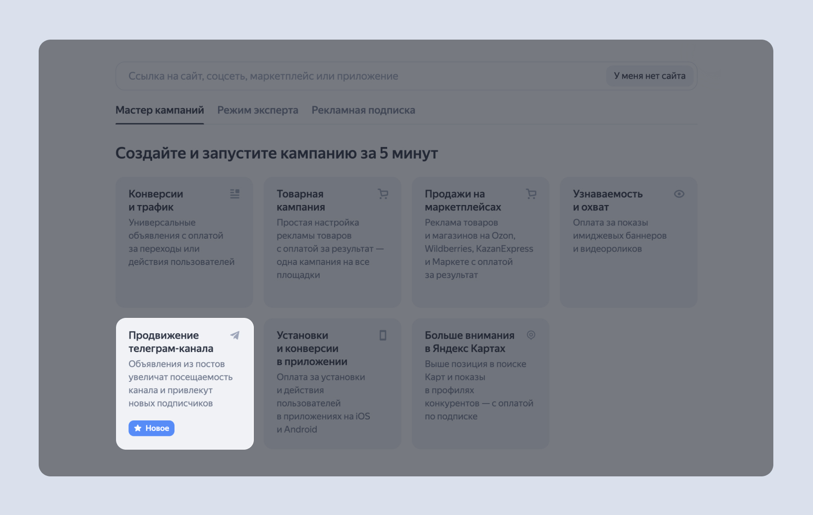 В Директе при создании рекламных кампаний теперь доступен отдельный тип для продвижения Telegram-каналов. С его помощью можно рекламировать различные публикации в канале мессенджера.
