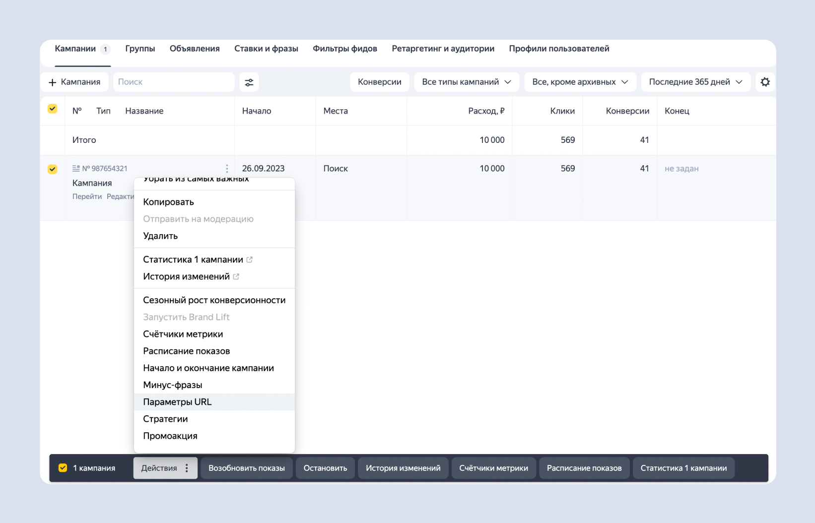 Чтобы не заходить в каждую отдельную группу или объявление и не проставлять каждую метку вручную, можно в одном месте указать общую метку. Для этого потребуется перейти в меню «Действия», затем открыть «Параметры URL» на странице «Кампании», «Группы» или «Объявления»:
