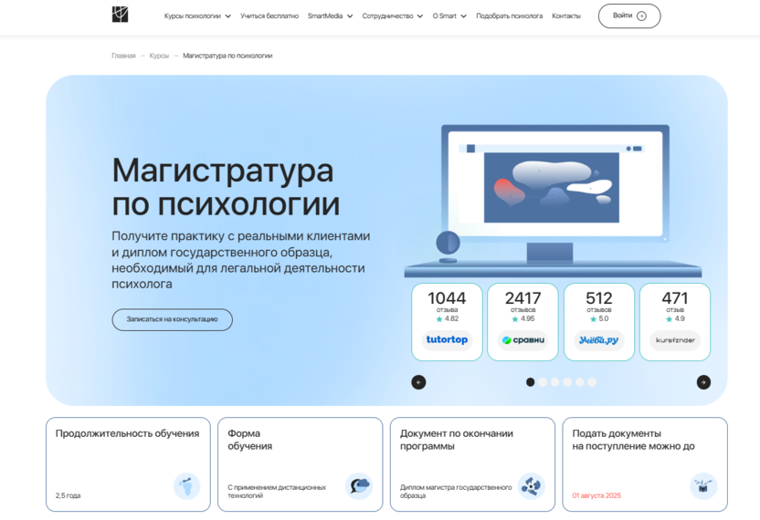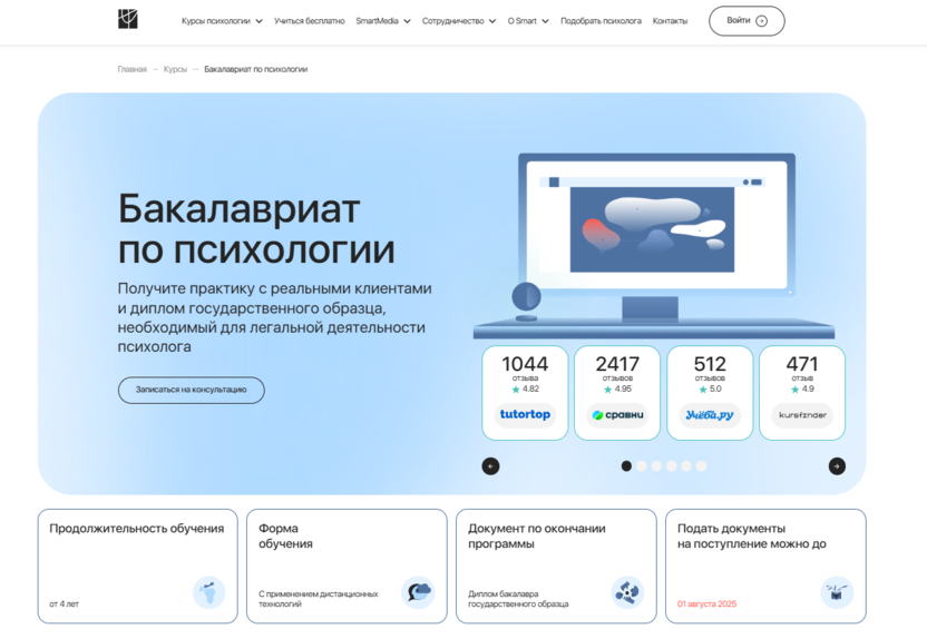 - Формат: обучение с применением дистанционных технологий – видеолекции, вебинары, возможность практики с реальными клиентами через агрегатор SmartHelp, круглосуточная поддержка кураторов.