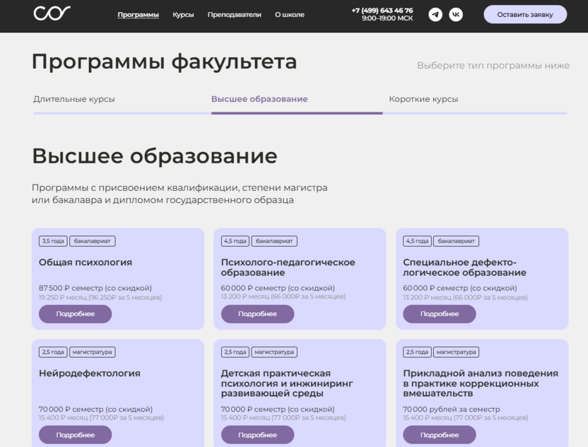 - Стоимость: от 45 000 рублей за семестр, возможна скидка до -30%.