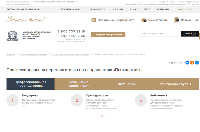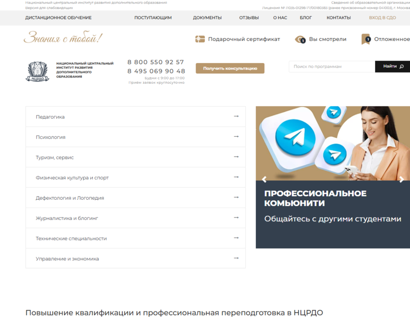 - Формат: обучение проводится полностью дистанционно с применением видеолекций, вебинаров, практических заданий и тестирования, что обеспечивает обратную связь от преподавателей.
