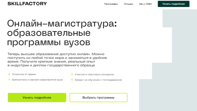 - Формат: обучение проходит в режиме реального времени - доступны как онлайн-курсы, так и занятия на кампусе. Включает видеолекции, вебинары и практические задания.
