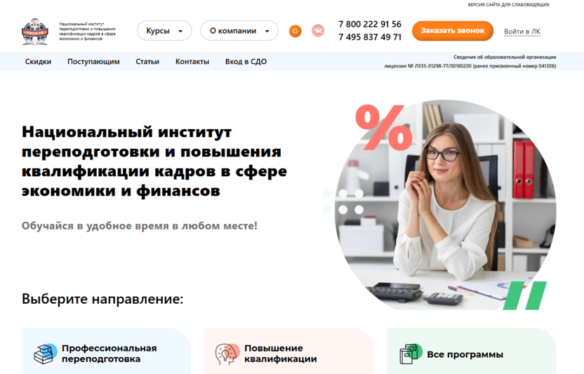 Национальный институт переподготовки и повышения квалификации кадров в сфере экономики и финансов специализируется на профессиональной переподготовке и повышении квалификации в ключевых отраслях экономики. Обучение осуществляется полностью в дистанционном формате, что позволяет студентам из любой точки России успешно освоить программу. Преподавательский состав включает 80% кандидатов наук с практическим опытом, что обеспечивает высокое качество знаний. Каждый выпускник получает документ об образовании установленного образца, что подтверждает их квалификацию и востребованность на рынке труда. Специальная система скидок доступна для групп от трёх человек, а также пенсионеров. Обязательное соответствие федеральным государственным образовательным стандартам гарантирует актуальность и качество программ.