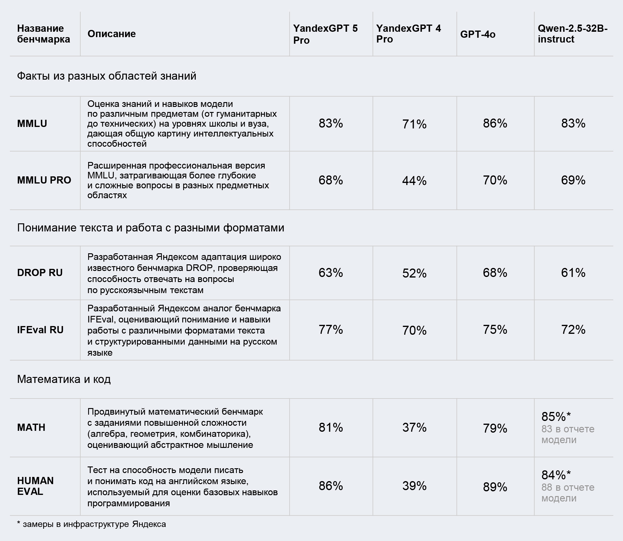 Семейство моделей YandexGPT 5 включает мощную языковую модель Pro и облегченную версию Lite. По данным замеров компании методом слепого сравнения (Side by Side, SBS), YandexGPT 5 Pro сравнима по качеству ответов с GPT-4o и в 64% случаев превосходит китайскую модель Qwen-2.5-32b-Instruct в решении стандартных задач.