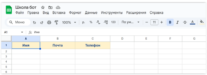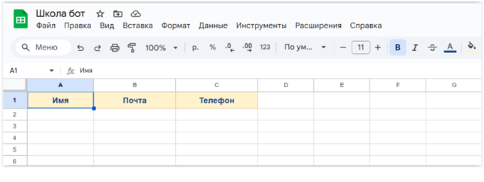 Сначала заготовим Google Таблицу. Сделать её, разумеется, надо в том самом аккаунте Google, с которым установлено сопряжение с BotMan. Итак, входим в аккаунт и делаем таблицу с именем «Школа бот», например. В таблице создаем три столбца «Имя», «Почта» и «Телефон».