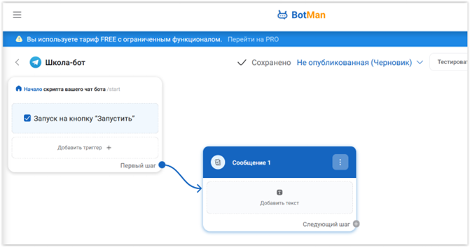 Вернемся к нашему боту. Настраиваем блок «Сообщение 1», для чего кликаем по нему, справа появляется окно настройки.