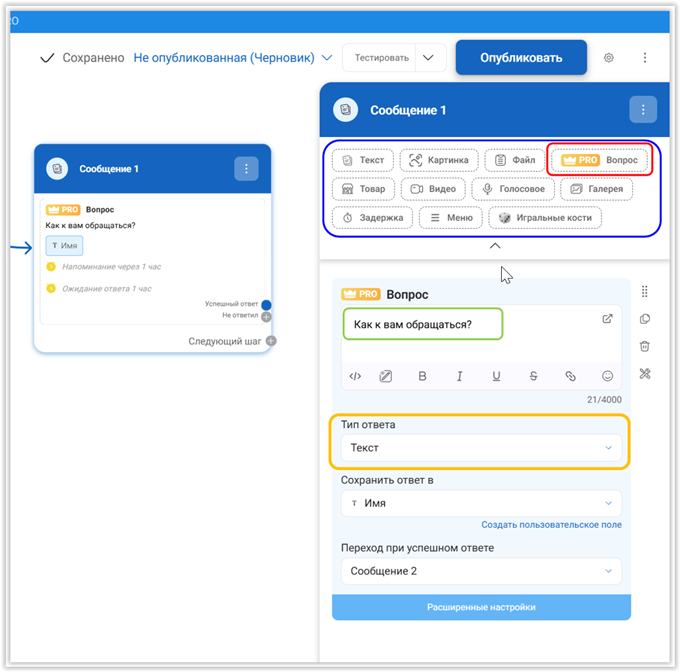 Блок «Сообщение» имеет множество профилей, которые отображаются кнопками в верхней части (синяя рамка). Для диалога мы выбираем профиль «Вопрос» (красная рамка) и кликаем по соответствующей кнопке.