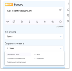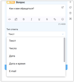 Второй блок настраиваем почти так же, как первый. Разница только в том, что вводим текст вопроса «Ваша почта», а для типа ответа выбираем из выпадающего списка: «E-Mail». Для сохранения ответа снова выбираем системное поле, и в правом столбце появляется «E-mail» – BotMan сам подсказывает, что он в данном поле готов увидеть. Сохраняем всё это.