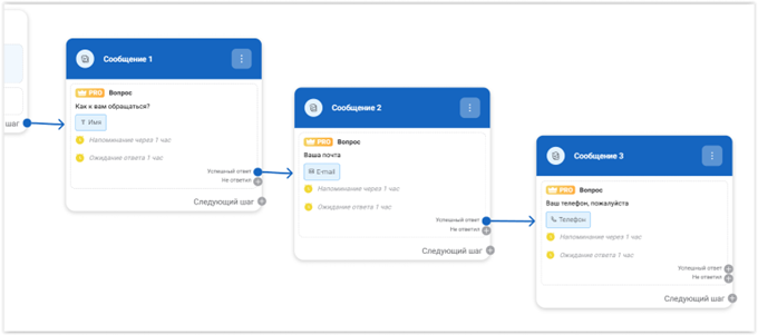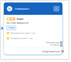 Рассматривая готовый блок, видим, что по умолчанию выставлено «Напоминание через 1 час» – это на случай, если клиент начал ввод информации, но почему-то «завис», тогда ему отправляется напоминание. Ожидание ответа тоже 1 час. Эти параметры таймера настраиваемые, их можно менять, но мы пока оставим то, что есть.