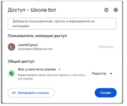 Нам надо настроить доступ к таблице. В правом верхнем углу есть овал «Настройка доступа». Кликаем по нему и в появившемся окне в списке «Общий доступ» выбираем «Все, у кого есть ссылка». Больше никаких настроек делать не надо – BotMan уже получил все необходимые права доступа при согласовании аккаунтов.