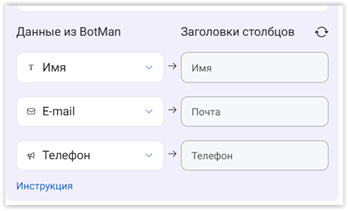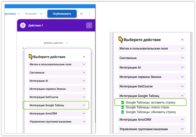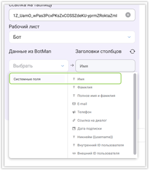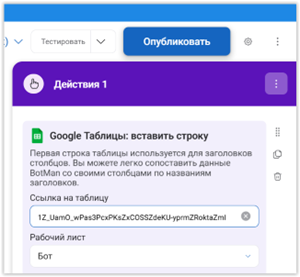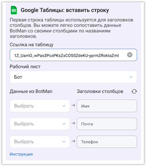 Нас сейчас интересует строка «Интеграции Google Таблиц». Раскрываем список и выбираем «Google Таблицы: вставить строку». Теперь BotMan «интересуется», с какой именно таблицей ему взаимодействовать, для чего предлагает заполнить строчки в появившемся окне: