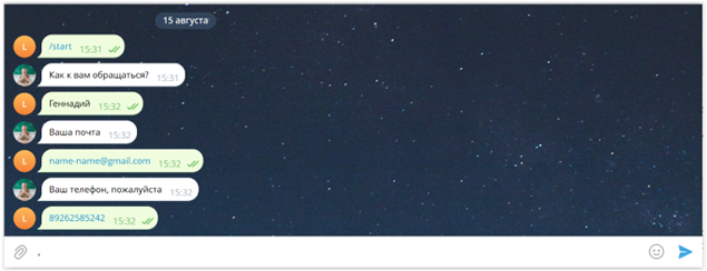BotMan – гибкий инструмент и допускает разные варианты одного и того же сценария. Так, например, поскольку аккаунты в Telegram привязаны к номерам телефонов, в BotMan есть механизм «Поделиться телефоном», дающий возможность посетителю не вводить свой номер заново, а просто нажать кнопку и бот автоматически перепишет номер телефона из аккаунта посетителя.