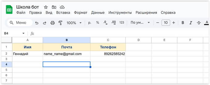 Теперь можно перейти в таблицу и посмотреть, что там. С удовлетворением видим, что введенная в бот информация уложилась, куда надо. Что нам и требовалось.