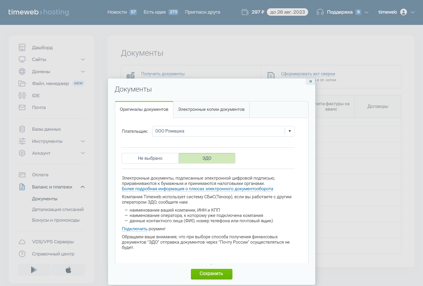 Для получения отчетных документов от Timeweb в электронном виде, вам необходимо: