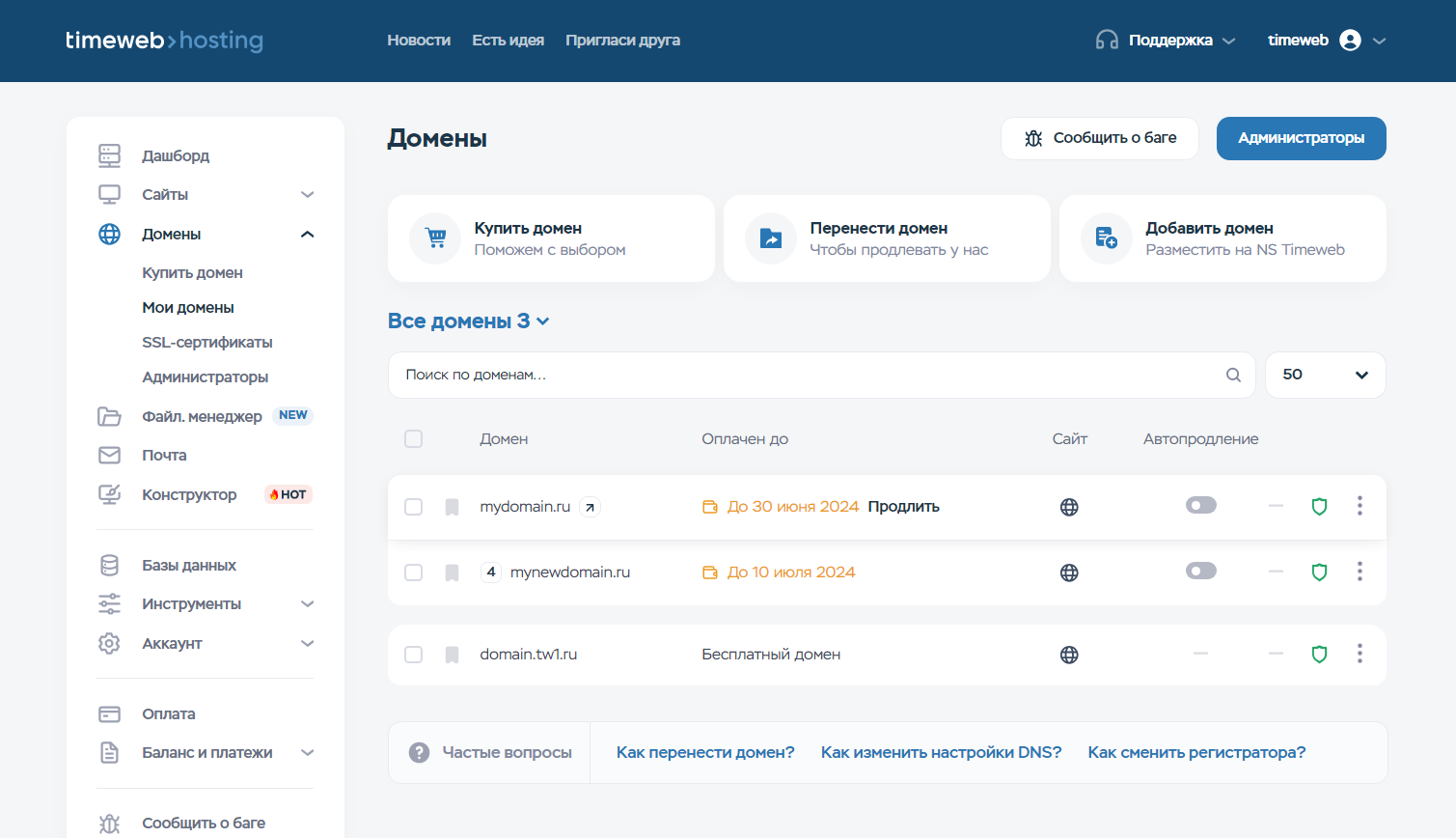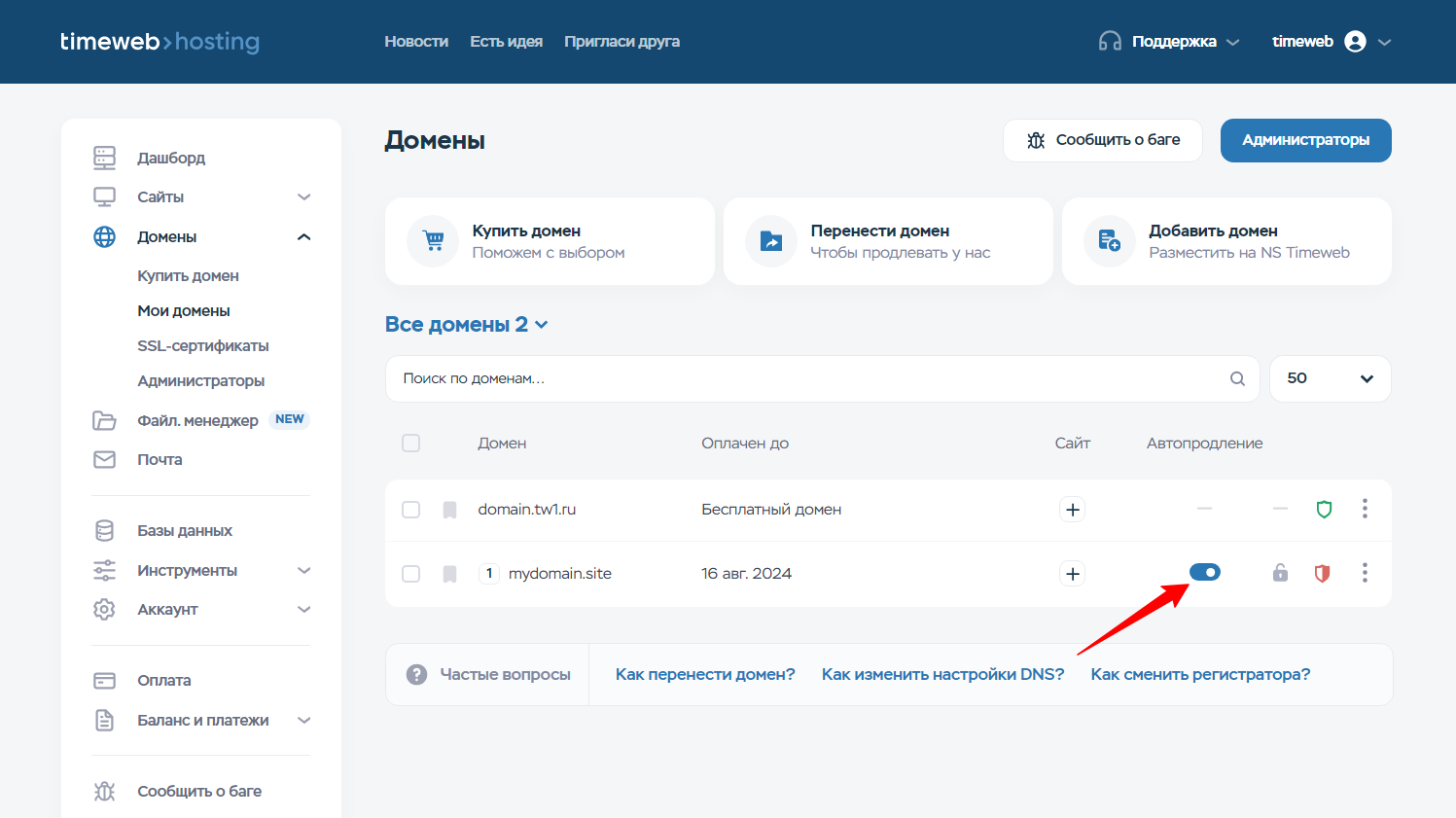 - Автопродление доменов возможно только для доменных имен партнеров-регистраторов Timeweb, зарегистрированных в Timeweb или перенесенных в любой момент в Timeweb. Включение автопродления для перенесенных доменов возможно на следующий день после переноса.