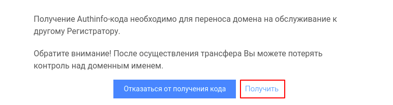 Сообщите регистратору email или телефон для получения Authinfo-кода. Для этого необходимо предоставить регистратору заявление от администратора домена:
