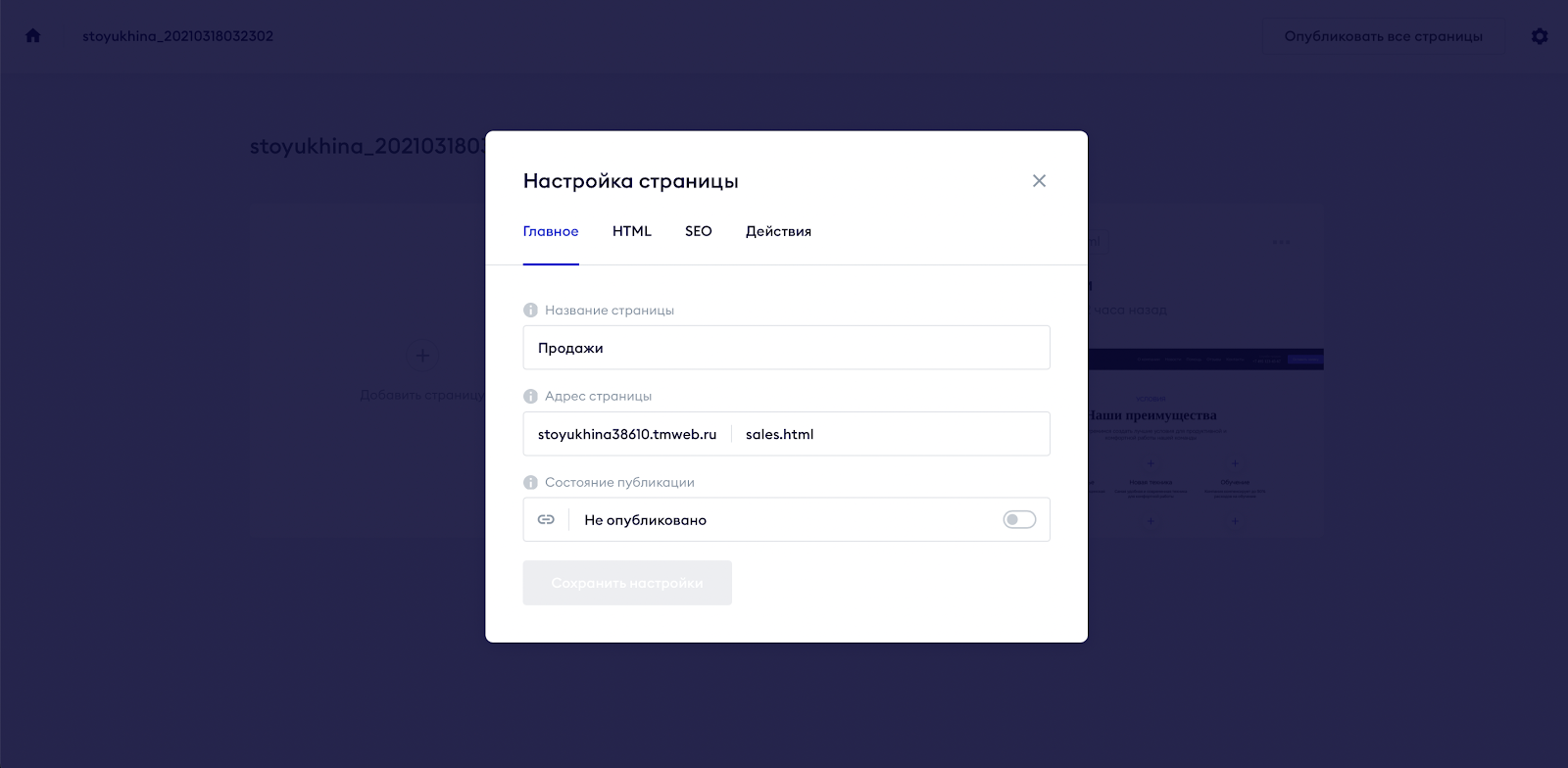 Адрес страницы показывает, как ваша страница будет называться в домене после публикации. Часто она называется по типу своего наполнения. Например, Продажи — /sales.html
