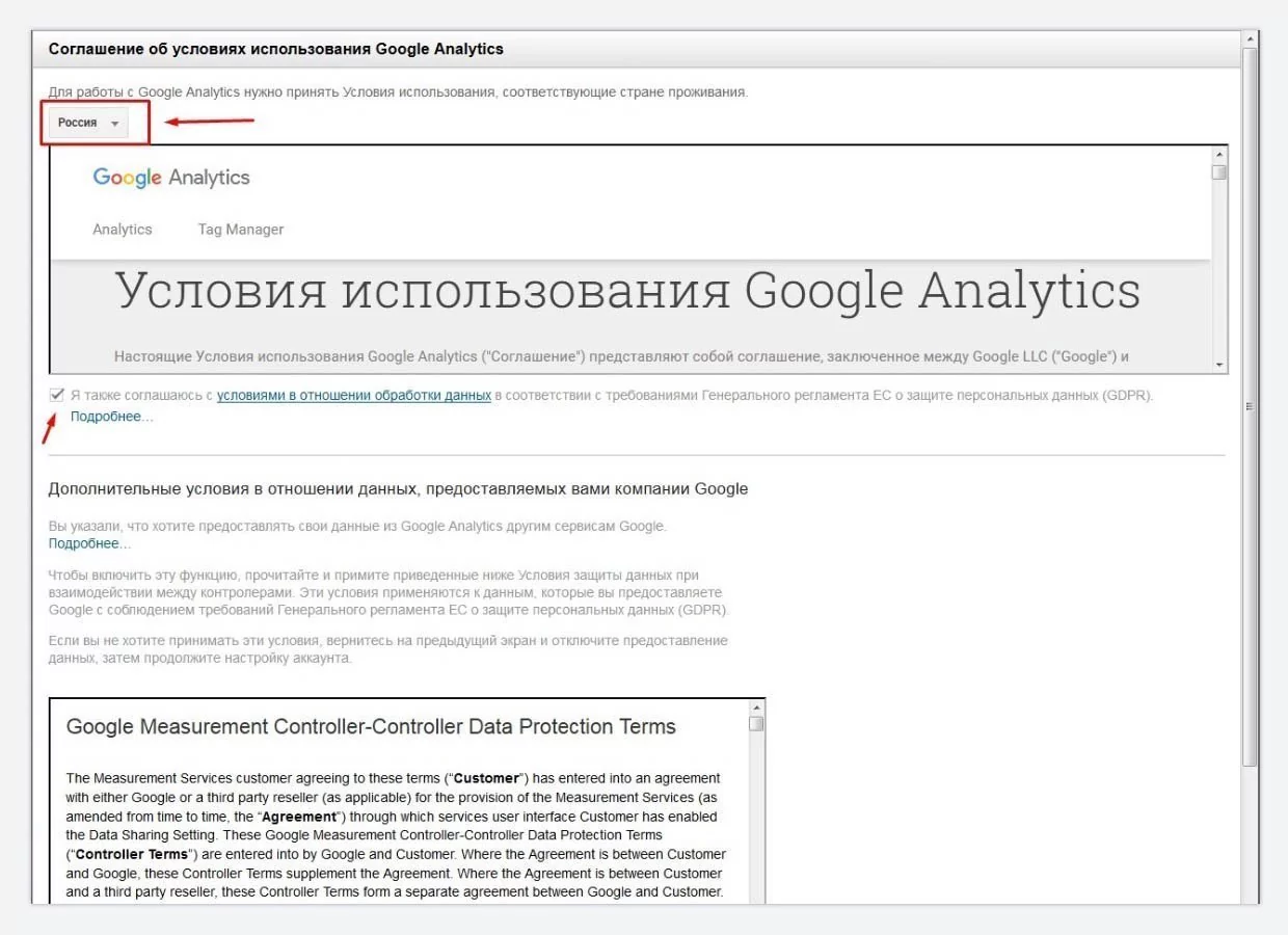 По умолчанию система предполагает, что вы из США. Выбирайте страну, в которой проживает владелец домена вашего сайта, ставьте галочки и завершайте регистрацию.